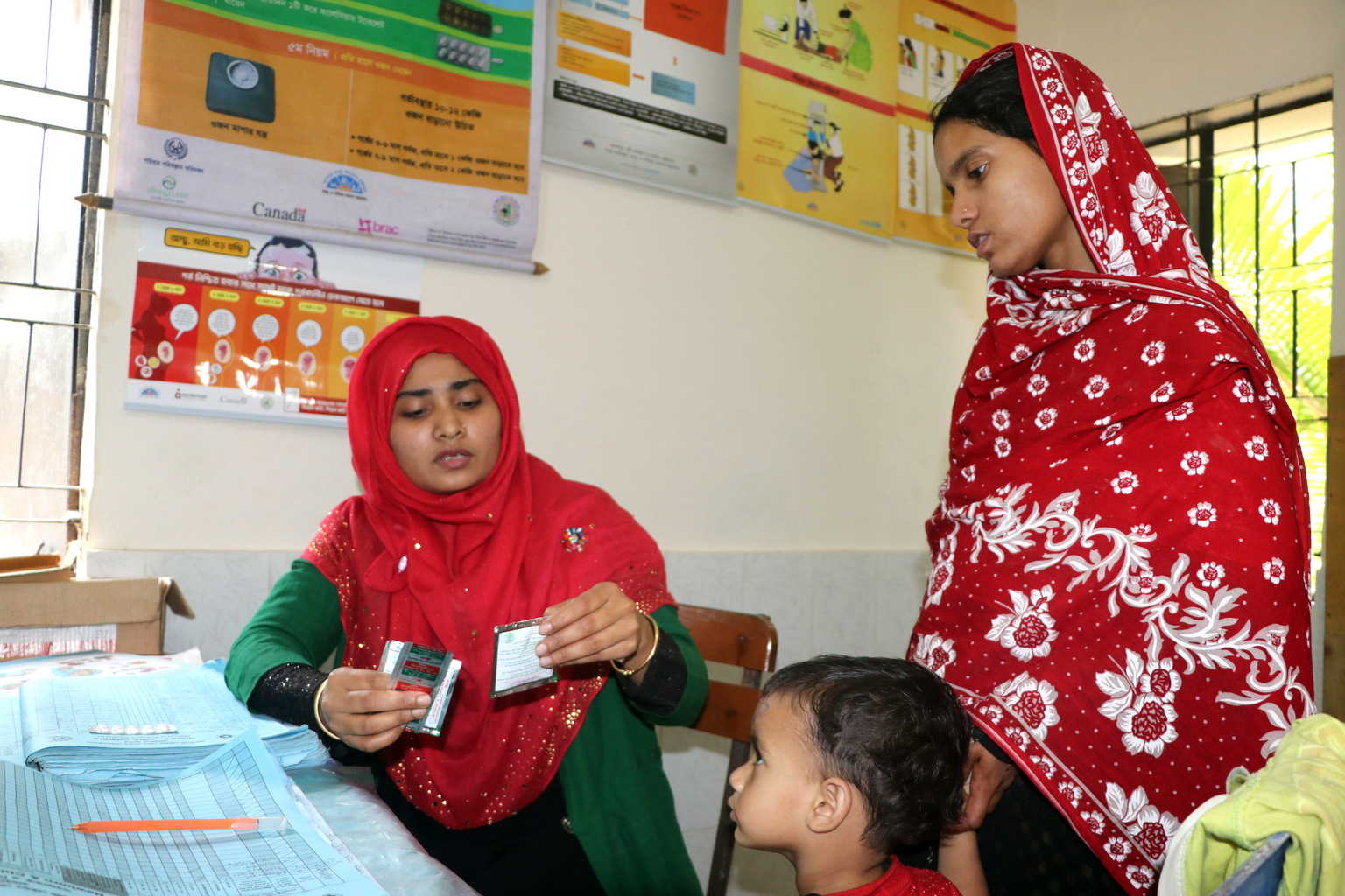 Les premiers en ligne sont Mme Hazera avec son fils, Hasan, âgé de 22 mois, ainsi que Mme Halima avec son petit-fils Siyam, âgé de quatre ans. Les deux garçons souffrent de diarrhée depuis plusieurs jours et sont visiblement affaiblis. Tous deux ont reçu des sels de réhydratation orale à faible osmolarité (SRO) de la part de leurs soignants, mais après un examen attentif, Tania leur prescrit des suppléments de zinc pour compléter les SRO. Elle discute du traitement et transmet quelques informations supplémentaires sur la santé et l’hygiène aux soignants, qui quittent la clinique rassurés. Après leur départ, Tania met à jour ses dossiers et prend des notes pour le suivi.