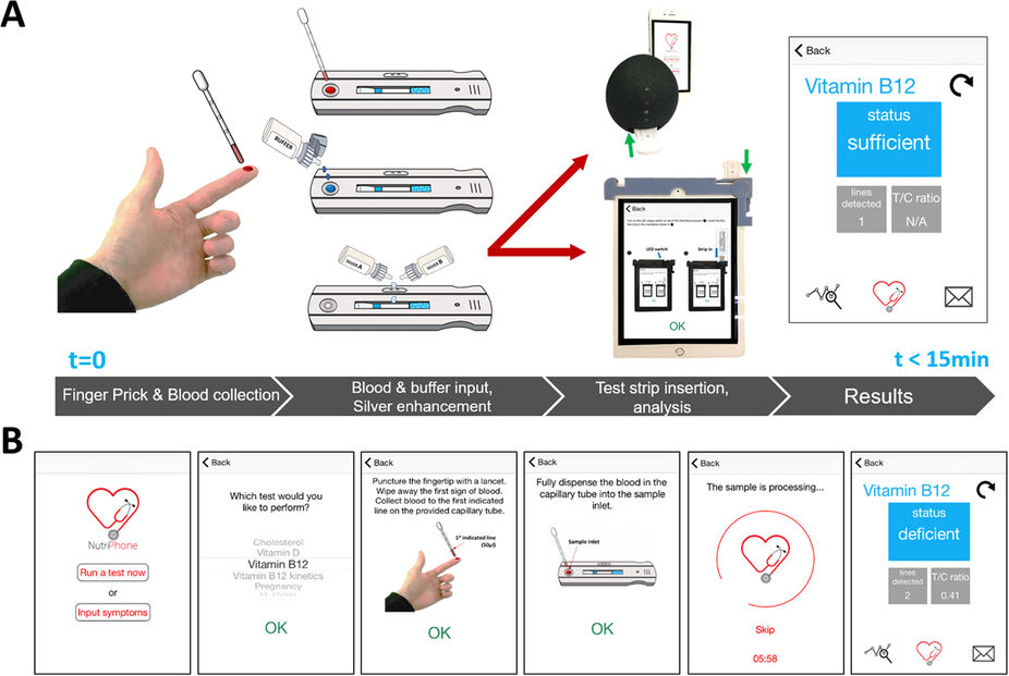 NutriPhone requires minimal training, no storage or transportation of test samples, uses a minimally invasive finger prick blood sample, and could be easily deployed in a variety of settings including at-home use, research, surveillance, monitoring and evaluation, and health care including primary health care settings in remote areas. Similar to other mobile device-based diagnostic systems, NutriPhone has the capabilities to track health-related changes over time, and to communicate results via e-mail or text messaging.