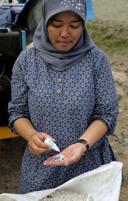 Layli works with the Bima regional government to provide the mobile salt iodization machine operators with potassium iodate. She regularly monitors the performance of the machines, dosing pumps and mixers and coordinates any equipment repair or technical assistance needed.