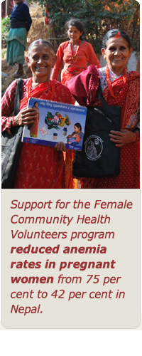 The reduction in anemia rates from 75 per cent to 42 per cent in pregnant women in Nepal is due in large part to strong support for the program at every level – from the central level to the Chief District Health Officers and the Chiefs of the Health and Sub-health Posts.