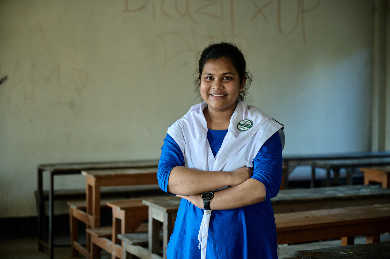 Nutrition International distributed special badges to the Pushti Bondhus. Joya and the other selected students wear the badges as part of their uniform, giving them a sense of recognition and a feeling of empowerment.