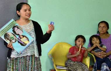 It’s diarrhoea season and Adelina is talking about how to treat this potentially deadly illness. Using the local language of Pocomchi, she explains that when children get sick with diarrhoea, they should continue to be fed, be given fluids and treated using a combination of oral rehydration salts (ORS) and zinc tablets.