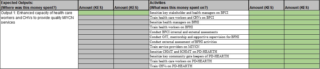 One of the most valuable tools developed by NTEAM to help operationalize the CNAPs is the multistakeholder financial tracking tool. This allows counties to monitor nutrition expenditures by activity and outcome across government, NGOs and the private sector, thus identifying the funding available for each outcome and where resources fall short. See Figure 2 for a sample section of the financial tracking tool being used in one county.